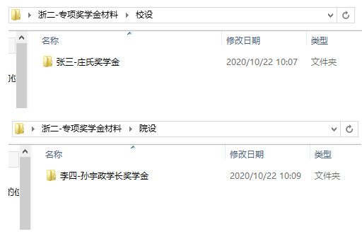 备注:校设和院设奖学金分开汇总(即两个文件夹,文件夹里每个学生的材料单独整理成一个文件夹,以姓名+专项奖学金名称(如张三-庄氏奖学金)。