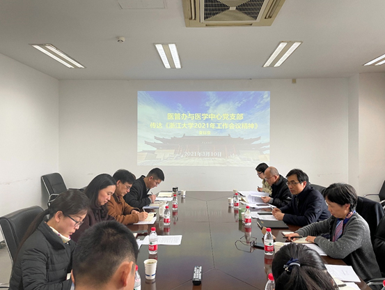 医管办主任夏标泉为支部成员讲授党课,传达了浙江大学2021年度工作会议上党委书记任少波《拓展新格局 开启新征程 坚定不移走向世界一流大学前列》和校长吴朝晖《迈好“十四五”第一步 开创“双一流”新气象 为迈向世界一流大学前列奠定2021年坚实基础》讲话精神,解读了“十三五”办学成就、学校改革发展的战略思路、未来五年的重点方向、未来一年的重点工作等内容。会议结合党支部的建设,对医管办和医学中心过去一年的工作做了总结,并对2021年的工作提出了更高的要求。夏标泉表示,希望所有党员在新的一年凝聚力量,奋进拼搏,再创佳绩。
